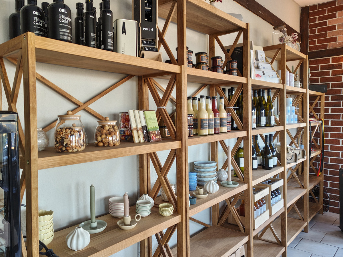 Hausgebackene Kuchen, gutes Brot, kleine herzhafte Gerichte und Kaffee in ruhiger Atmosphäre.