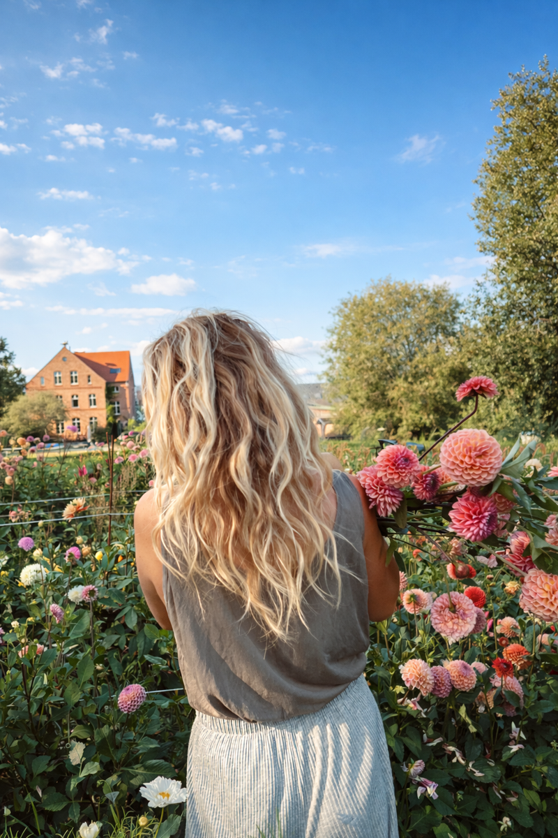 Ich bin Sara und baue im idyllischen Örtchen Zerpenschleuse Schnittblumen im Freiland an. Dabei achte ich besonders auf Nachhaltigkeit und außergewöhnliche Blumensorten, die man im konventionellen Handel kaum findet. Meine Blumen wachsen im Rhythmus der Natur – ohne Pestizide, ohne lange Transportwege und mit viel Zeit zum Reifen. Jede Saison bringt ihre eigene Farbwelt und Stimmung mit sich: von zarten Pastelltönen im Frühling bis zu üppigen, warmen Nuancen im Spätsommer. Die Flowerfarm ist nicht nur ein Anbauort, sondern auch ein ruhiger Platz inmitten von Feldern und Weite. Hier dürfen Menschen ankommen, durchatmen und selbst Blumen pflücken – ganz in ihrem Tempo, ganz nah an der Natur. Mich begeistert die Verbindung von Handwerk, Ästhetik und Natürlichkeit. Meine Blumen dürfen sich frei entfalten – mit Charakter, Bewegung und einer stillen, besonderen Ausstrahlung.